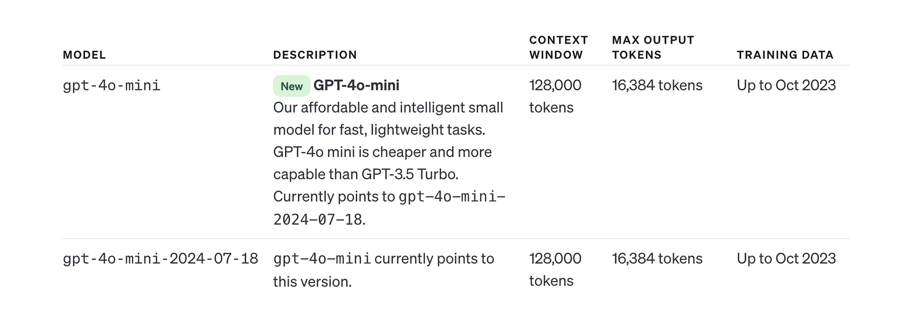 下面是 gpt-4o-mini 的上下文窗口处理的 Token 情况(摘自 Open AI 官网)。